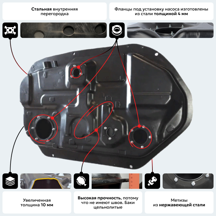 Бак повторяет геометрию оригинального бака и имеет те же габаритные размеры, крепежные и посадочные места. Фланец погружного модуля изготовлен из стали толщиной 4 мм со шпильками крепления погружного модуля М5х25 мм.